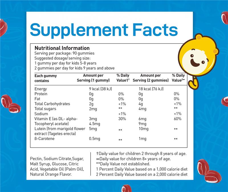 Serving Size: 1 gummy per day for children aged 5-8 years, 2 gummies per day for children aged 9 years and above